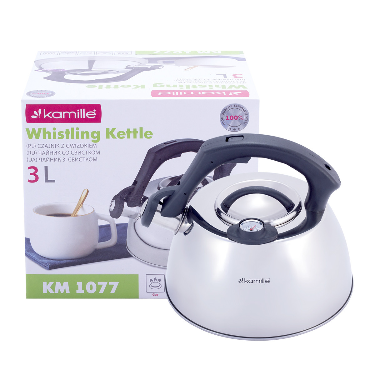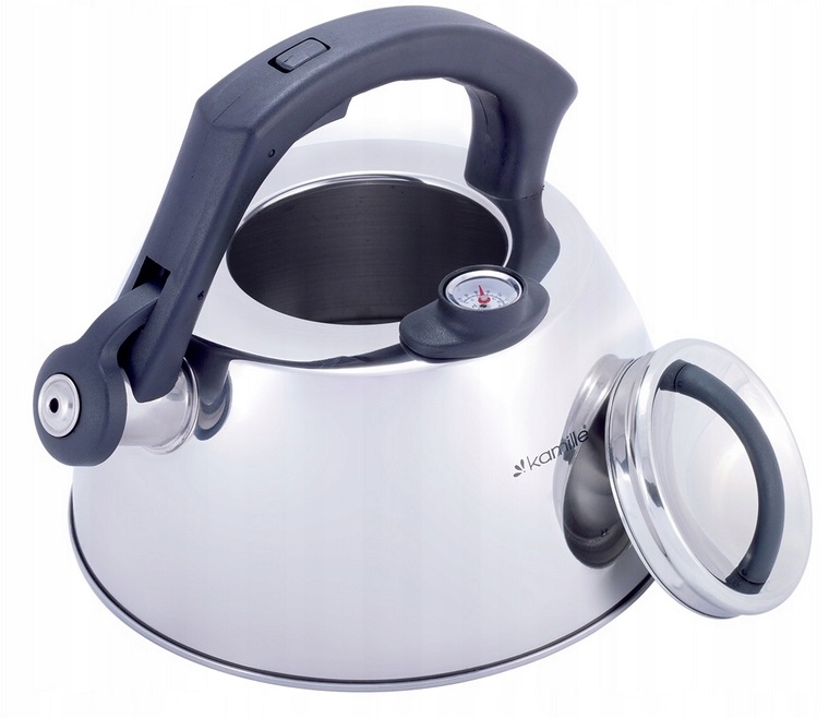Процесс чаепития давно прочно вошел в жизнь каждого человека во всем мире. И для того, чтобы приготовить ароматный чай, необходимо первым делом вскипятить воду. По сути, подогреть воду можно в любой кухонной посудине, но от вкуса воды зависит и вкус напитка, поэтому лучше использовать специально выделенную для этих целей посуду, а именно — чайники Kamille. Чайники Kamille изготовлены из высококачественных материалов с использованием новейших технологий производства, благодаря чему они подходят для интенсивного ежедневного использования, а их эстетичный внешний вид непременно подойдет к дизайну Вашей кухни. Чайник Kamille KM-1077 Материал: нержавеющая сталь. Общий объем: 3 л. Полировка металла: зеркальная. Тип ручки: фиксированная. Материал ручки: полипропилен. Цвет: черный. Материал крышки: нержавеющая сталь. Есть термометр. Диаметр дна (снаружи): 22 см. Высота (с ручкой): 19,5 см. Свисток: есть. Подходит для индукционных плит: да. Подходит для мытья в посудомоечной машине: нет. Особенности: эксклюзивный дизайн термометр (позволяет контролировать температуру воды для заваривания трав и т.п.) стильный современный дизайн высокая надежность и устойчивость к царапинам утолщенное индукционное дно удобный и прочный механизм открывания свистка Использование: на индукционной плите на стекло-керамической